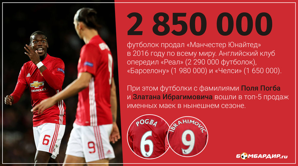 Среди продаж маек с нанесением фамилии лидирующие места занимают Месси и Роналду. На третьей и четвертой позициях Погба и Ибрагимович, пришедшие в «МЮ» летом. За ними следуют Месут Озил из «Арсенала», Неймар («Барселона»), Давид Де Хеа («МЮ») и Фелипе Коутиньо из «Ливерпуля».