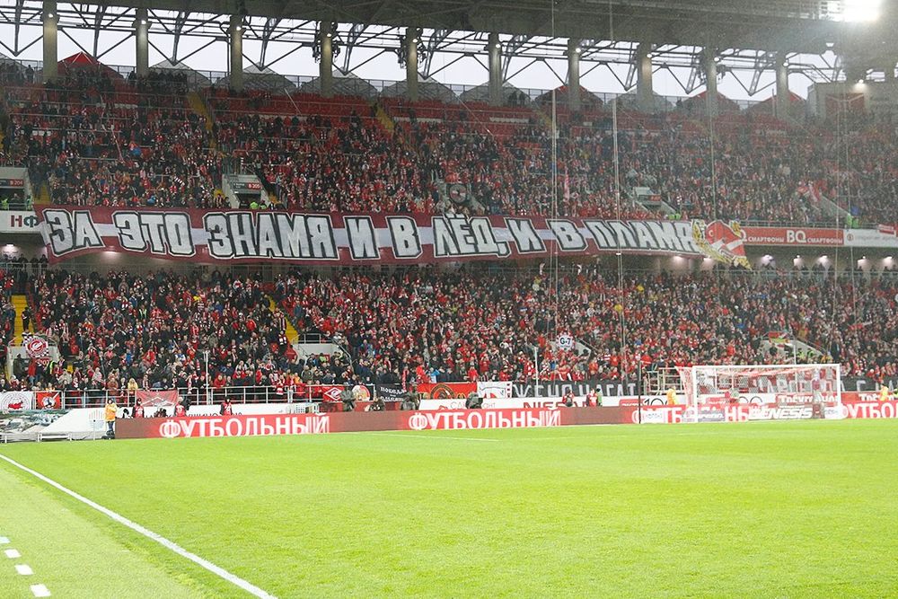 Сегодня «Спартаку» исполнилось 96 лет. Московский клуб основан 18 апреля 1922 года, а полуфинальная игра Кубка России с «Тосно» выпала на день рождения. На матче был и такой красочный баннер.