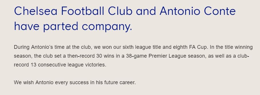 «Челси» и Антонио Конте расстались. Во время Антонио в нашем клубе мы выиграли шестой чемпионат Англии и восьмой Кубок Англии. В победном сезоне «Челси» установил рекорд из 30 побед за 38 матчей и выдал клубный рекорд в 13 побед подряд. Желаем Антонио успехов в его будущей карьере»
