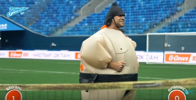 • Игра до семи очков в сумо-болл – спорное решение. С динамикой здесь тоже есть проблемы, а еще заметен перекос в сторону сильного преимущества игроков. Это единственный конкурс, где техника футболистов «Зенита» дала им возможность не сильно напрягаться, а в некоторых моментах есть подозрения на игру в поддавки.
