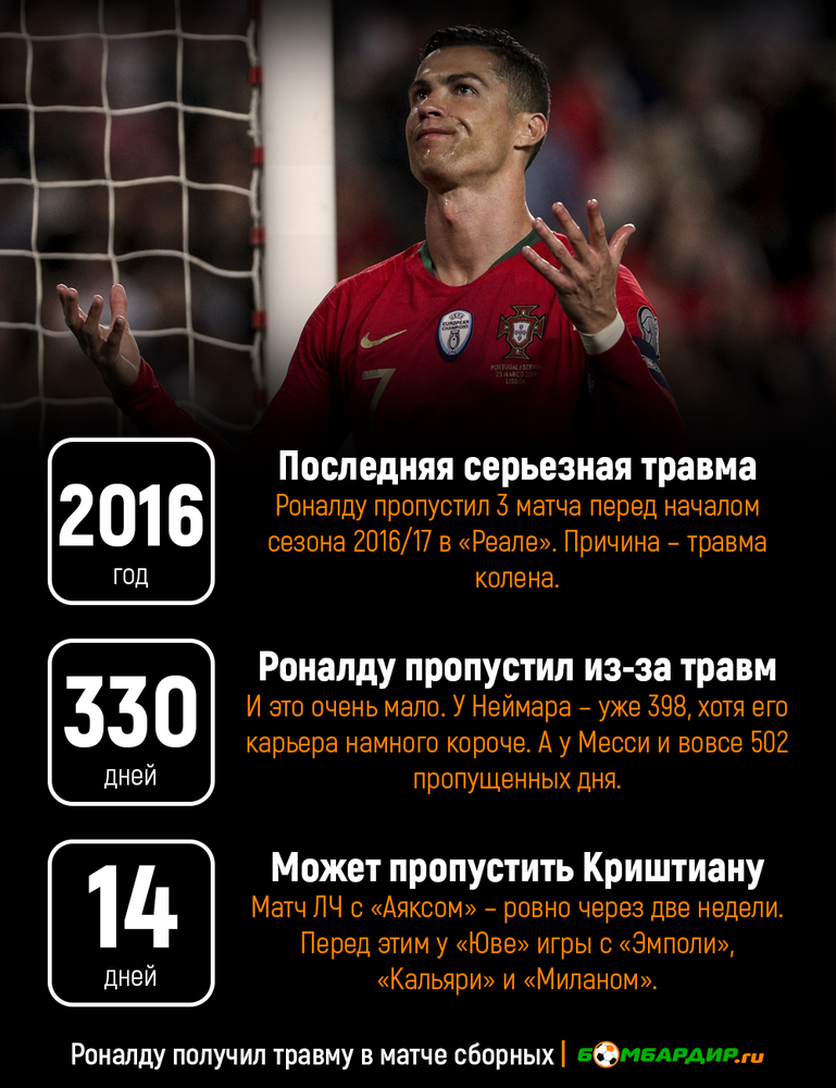 • Криштиану очень редко получает травмы. В последний раз он выбывал больше чем на месяц в 2016-м году, но тогда дело было в межсезонье. Скорее всего, его просто поберегли в начале сезона.