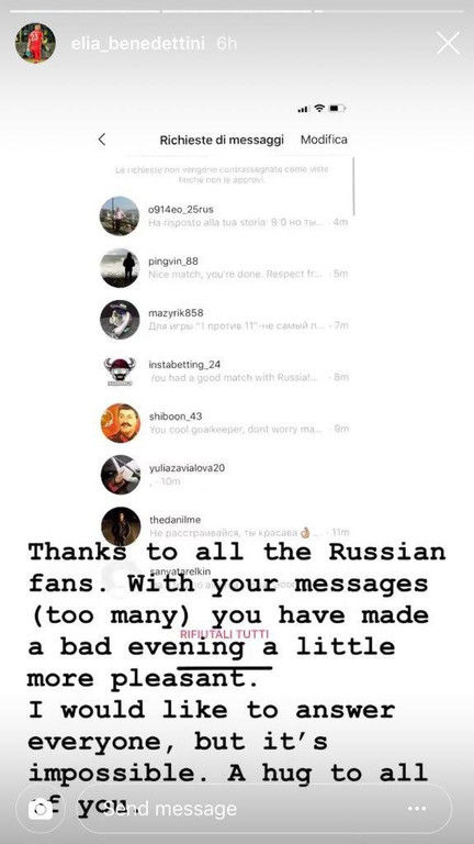 «Спасибо всем российским болельщикам. С вашими сообщениями (а их было очень много) этот вечер стал чуть более приятным. Я бы хотел ответить каждому из вас, но это невозможно. Обнимаю каждого», – написал Бенедеттини в ответ нашим фанатам.