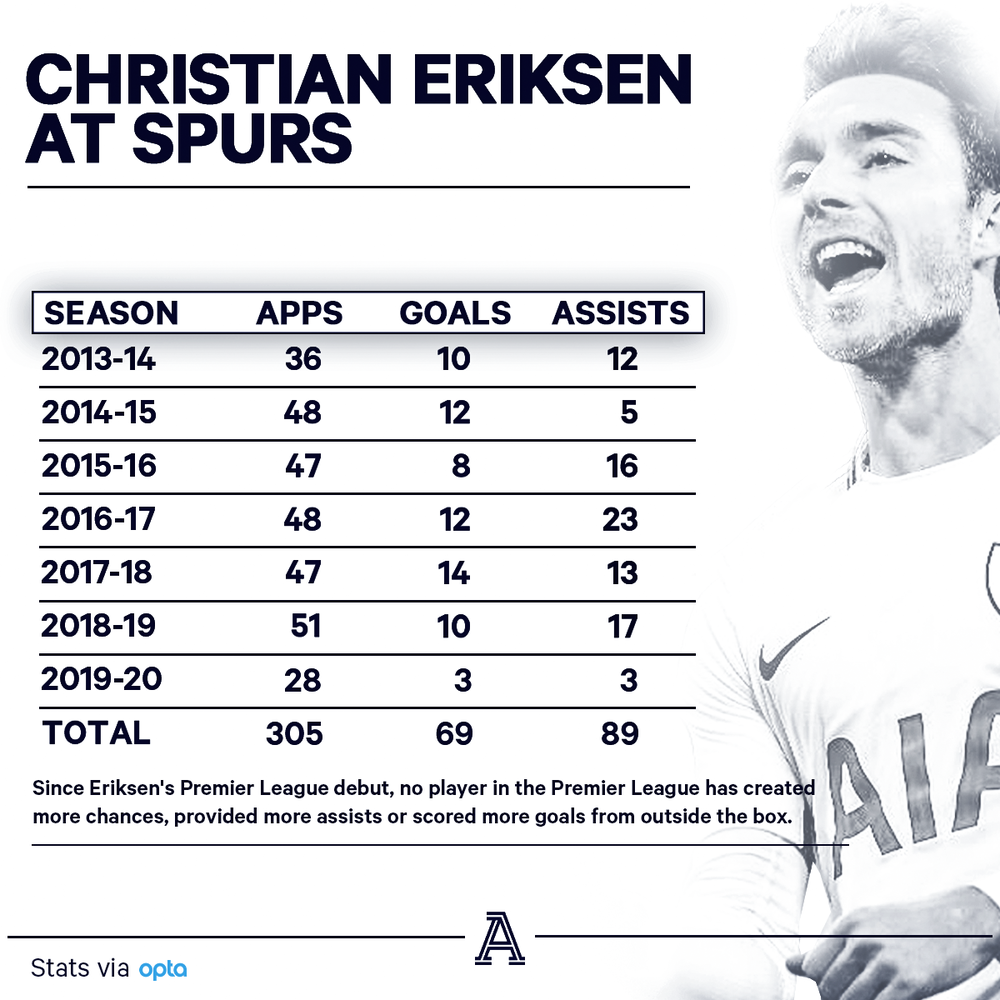 • В последних пяти сезонах Эриксен почти не травмировался и много играл (81% матчей). Это примерно 34 матча из 38 каждый сезон.
