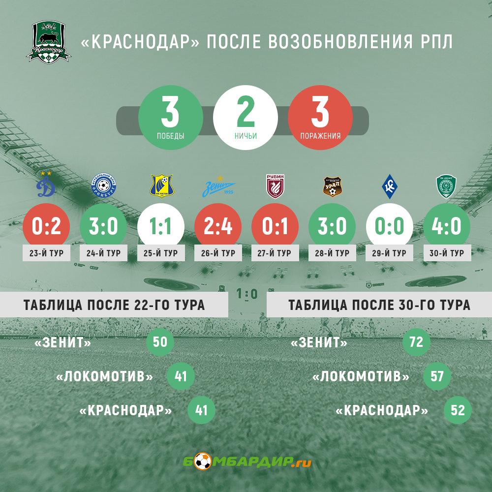 Сезон в РПЛ завершился: в ЛЧ сыграют «Зенит», «Локомотив» и «Краснодар». Для «Краснодара» само попадание на третье место стало большим достижением, хотя после 22-го тура он шел вровень с «Локомотивом». Летом «Локомотив» выдал серию из четырех ничьих, но «Краснодар» не воспользовался даже этим. И чуть не отдал место в ЛЧ ЦСКА.