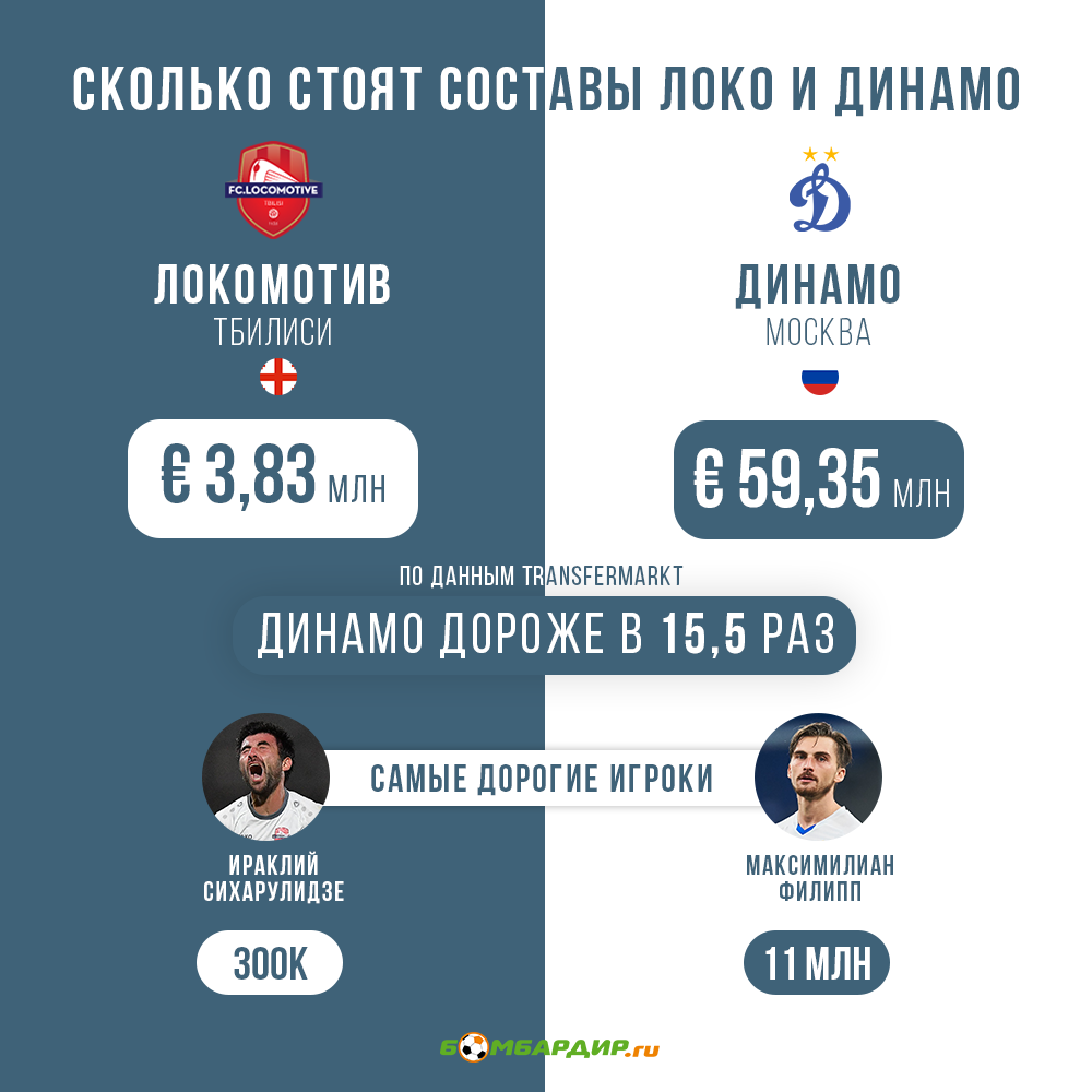 За «Локомотив» забили Сихарулидзе (по данным Transfermarkt, стоит 300 тысяч евро – самый дорогой игрок команды) и Гавашелишвили (100 тысяч), у «Динамо» – Комличенко (5 миллионов). И еще несколько цифр:
