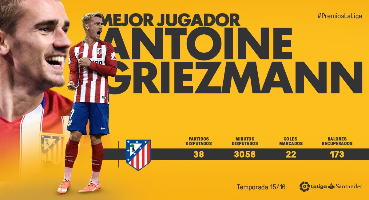 Лучшим футболистом сезона-2016/16 признан форвард «Атлетико» Антуан Гризманн, который в прошлом розыгрыше Примеры провел 38 матчей, забив 22 гола и сделав пять результативных передач.