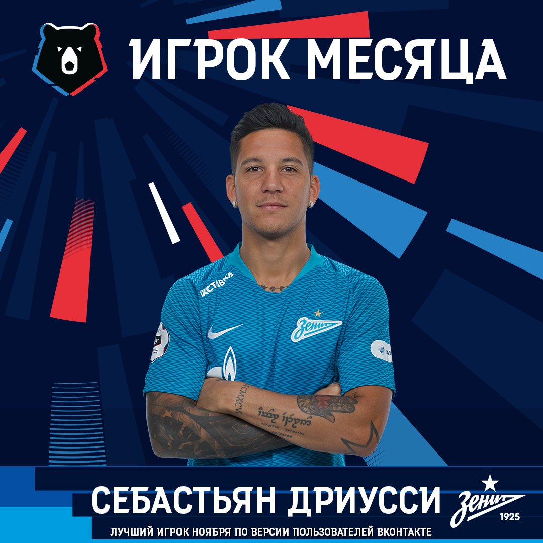 РПЛ огласила имя лучшего футболиста турнира по итогам ноября. Им стал нападающий «Зенита» Себастьян Дриусси.