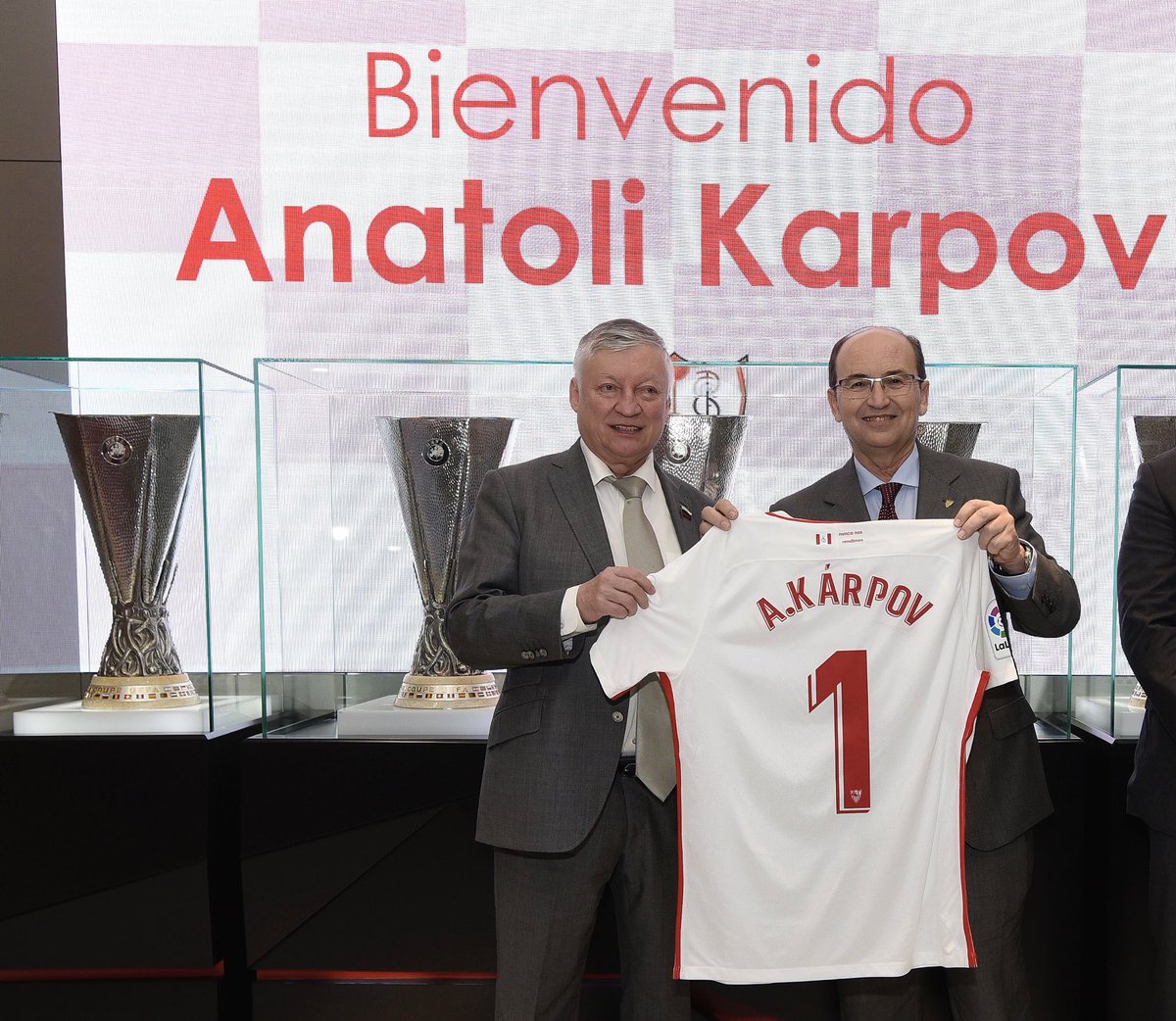 Российский шахматист Анатолий Карпов побывал на стадионе «Севильи» «Рамон Санчес Писхуан». Руководители испанцев провели экскурсию для гостя из России.
