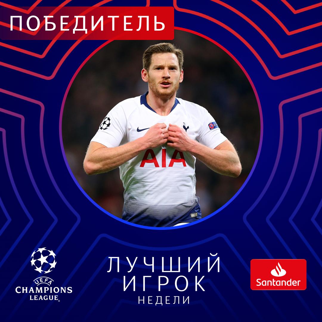 Защитник «Тоттенхэма» Ян Вертонген признан лучшим игроком недели в Лиге чемпионов.