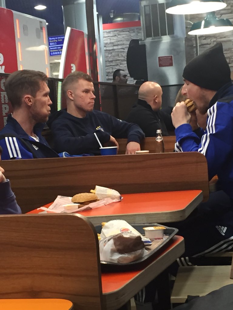 — Фотографии из ресторана сделал назойливый английский журналист. Мы вылетали в Лондон в семь часов утра, решили перекусить на завтрак. А других ресторанов в минском аэропорту не было. Мозгов у журналиста маловато: хоть бы написал, где и что это. Как-то не красиво вышло, но мы с ребятами в команде поприкалывались.