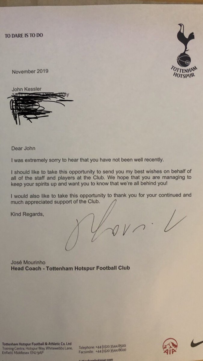 Главный тренер «Тоттенхэма» Жозе Моуринью обратился к больному болельщику Джону Кесслеру. Как сообщил друг фаната Фил Браун в твиттере, португалец написал на клубном бланке письмо.