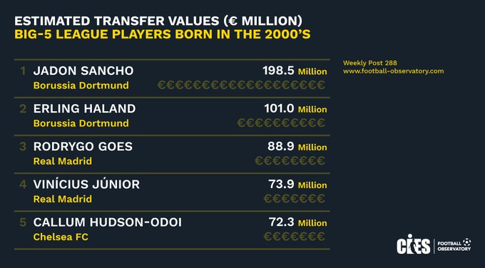 Компания CIES Football Observatory, занимающаяся исследованиями в области футбола, опубликовала список самых дорогих футболистов, родившихся в 2000-х годах. Его возглавил полузащитник дортмундской «Боруссии» Джейдон Санчо.