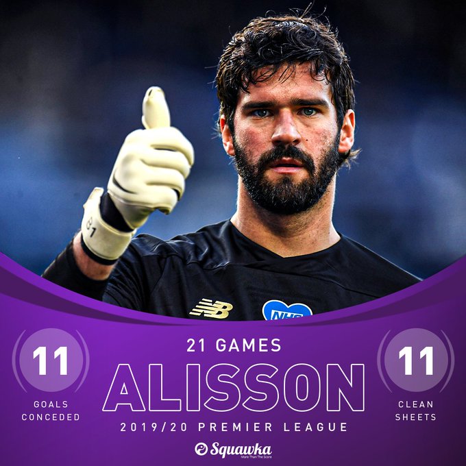 Голкипер «Ливерпуля» Алисон пропустил за 21 матч АПЛ 11 голов. У бразильца столько же сухих встреч.