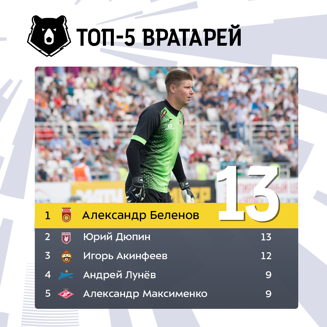 Лучший голкипер сезона РПЛ по сухим матчам определится только по итогам последнего тура. В его преддверии два футболиста имеют по 13 таких игр: Юрий Дюпин и Александр Беленов.