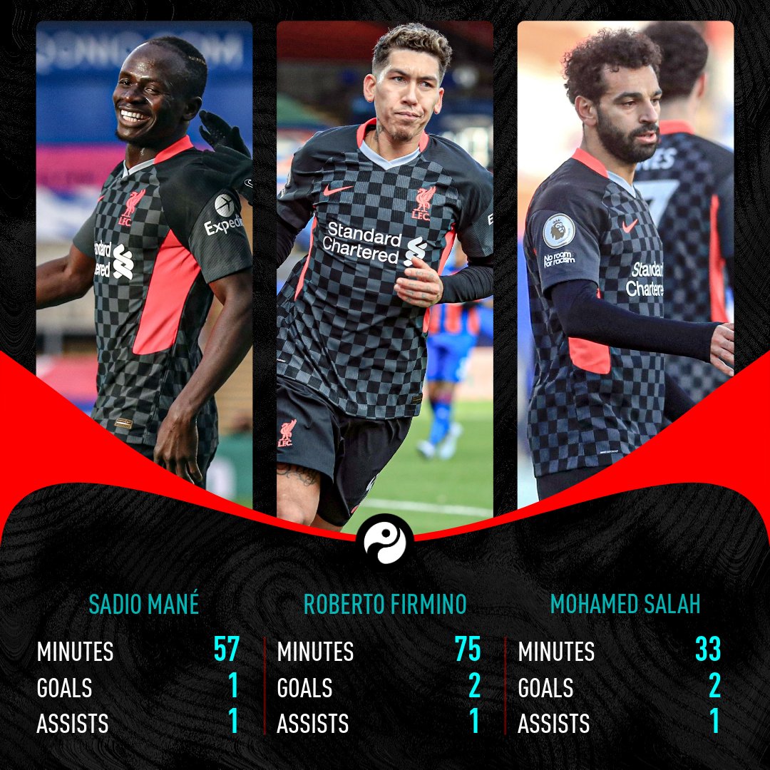 Игроки «Ливерпуля» Роберто Фирмино, Мохамед Салах и Садио Мане в матче 14-го тура АПЛ против «Кристал Пэлас» (7:0) забили не менее гола каждый и сделали не менее одной результативной передачи. Такое с ними троими произошло впервые в чемпионате.