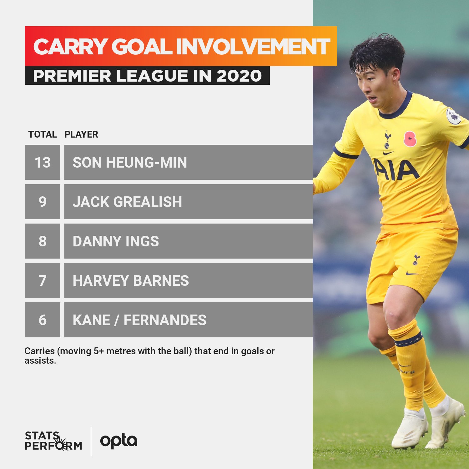 13 результативных действий форварда «Тоттенхэма» Хын-Мин Сона в АПЛ в 2020 году случились после его ведения. Это лучший показатель турнира.