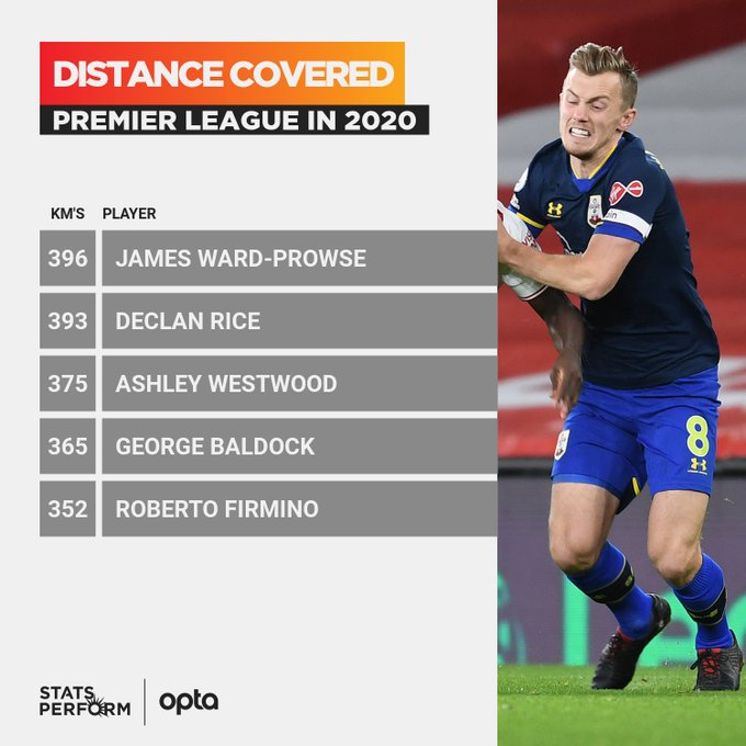 Полузащитник «Саутгемптона» Джеймс Уорд-Проус в 2020 году в рамках АПЛ преодолел дистанцию в 396 километров. Это лучший показатель в турнире.