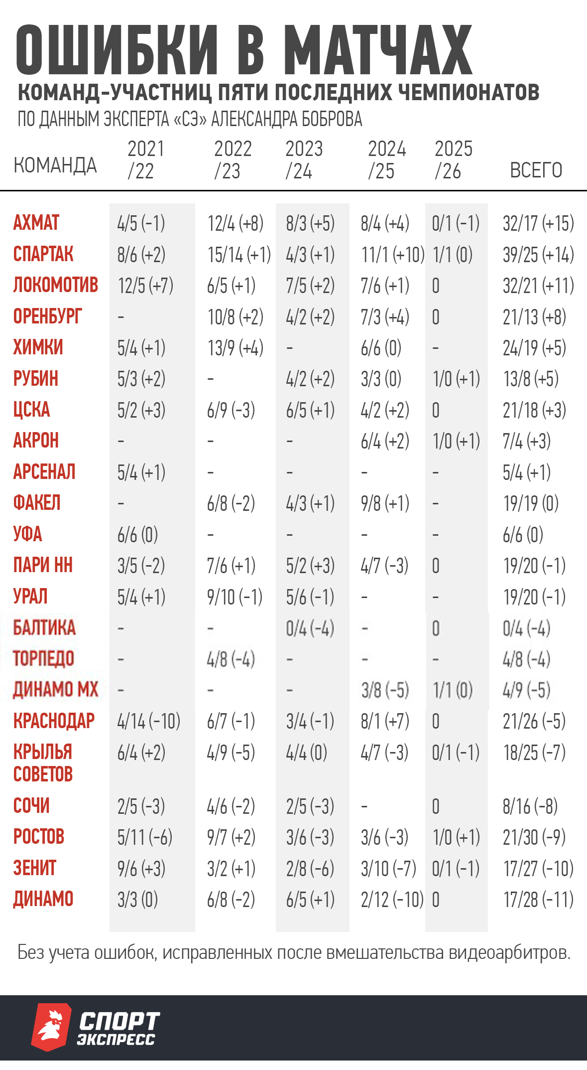 «Спорт-Экспресс» проанализировал ошибки арбитров за последние пять лет в РПЛ.