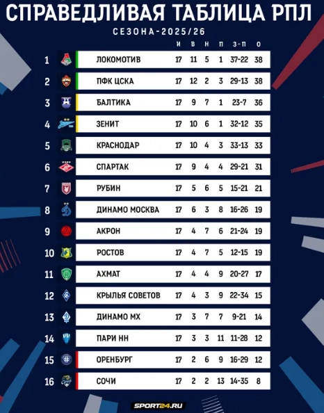 Sport24 составил альтернативную таблицу РПЛ после 17 туров.