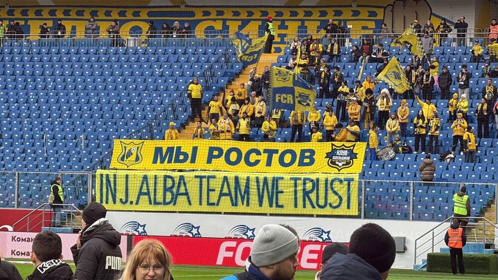 Болельщики ростовчан вывесили баннер в поддержку главного тренера Джонатана Альбы.