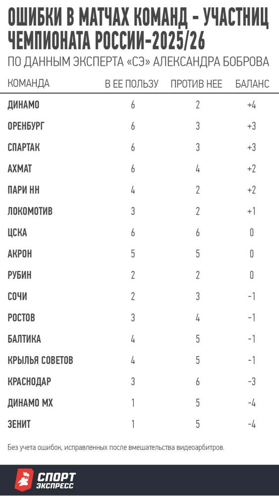 Эксперт «Спорт-Экспресса» по судейству Александр Бобров обновил сведения по ошибкам арбитров в сезоне РПЛ.