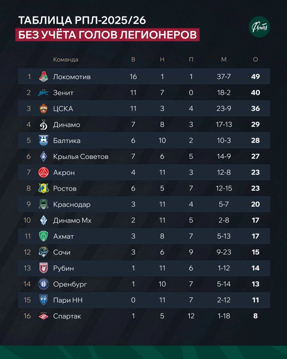 Составлена таблица сезона РПЛ с учетом голов только нелегионеров. Лидирует в ней «Локомотив».