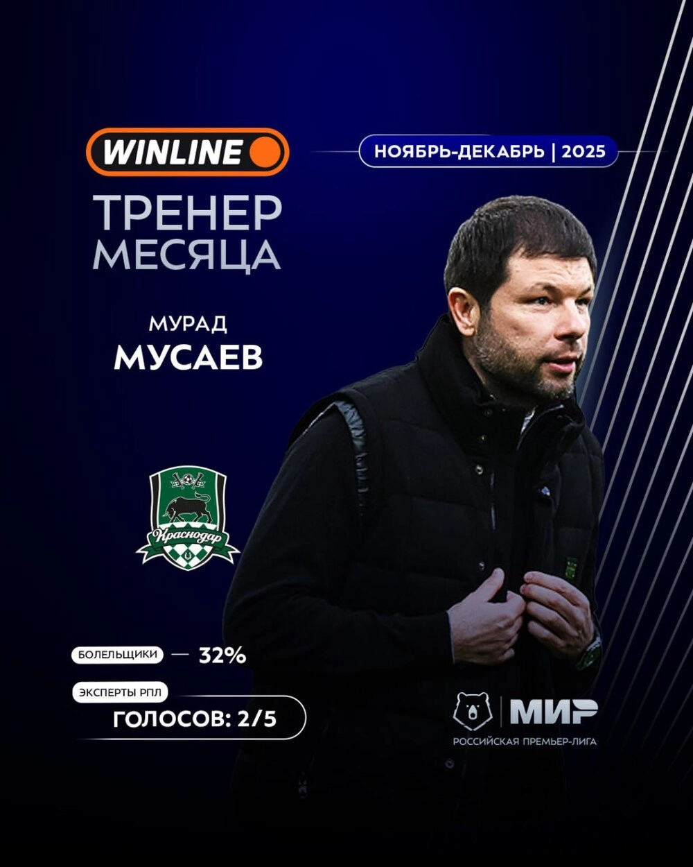 Главный тренер «Краснодара» Мурад Мусаев стал обладателем награды лучшему тренеру месяца в РПЛ по итогам ноября и декабря.