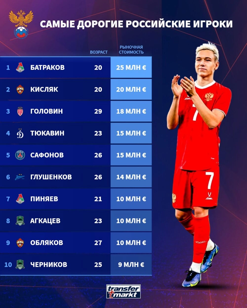 Transfermarkt на этой неделе обновил стоимость российских футболистов.