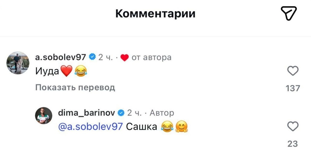 Форвард «Зенита» Александр Соболев опубликовал в соцсетях комментарий, адресованный Дмитрию Баринову.