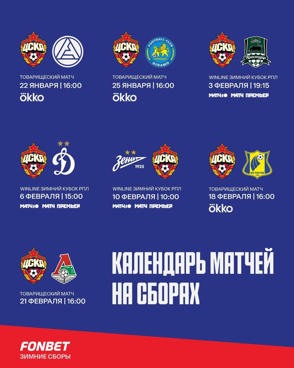 ЦСКА в ходе зимних сборов проведет 7 товарищеских матчей, причем 6 из них – против клубов РПЛ.