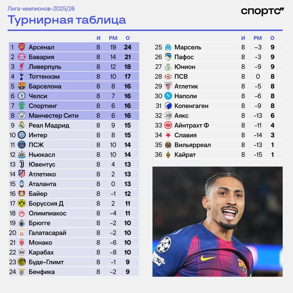 Завершился общий этап Лиги чемпионов сезона-2025/26.