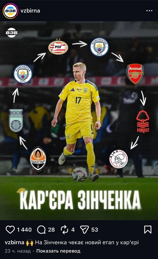 Украинский футбольный аккаунт Vzbirna напомнил все клубы Александра Зинченко после его трансфера в «Аякс».