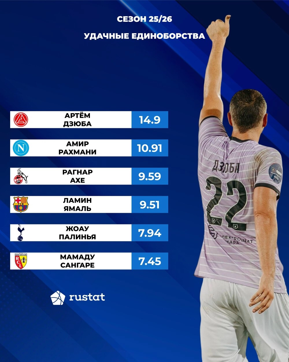 Нападающий «Акрона» Артем Дзюба, по данным «РУСТАТ», – лидер по количеству удачных единоборств среди игроков топ-5 чемпионатов и РПЛ.