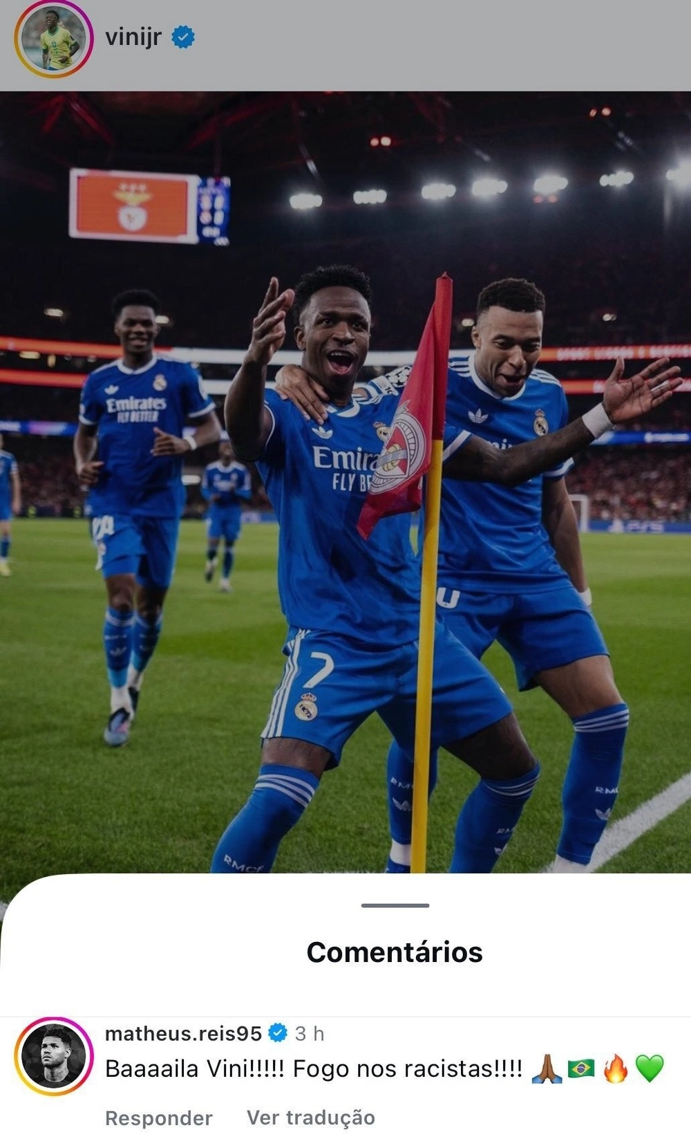 «Танцуй, Вини! Жги расистов! 🙏🏽🇧🇷🔥💚», – написал бразильский защитник армейцев в комментариях к публикации в соцсетях.