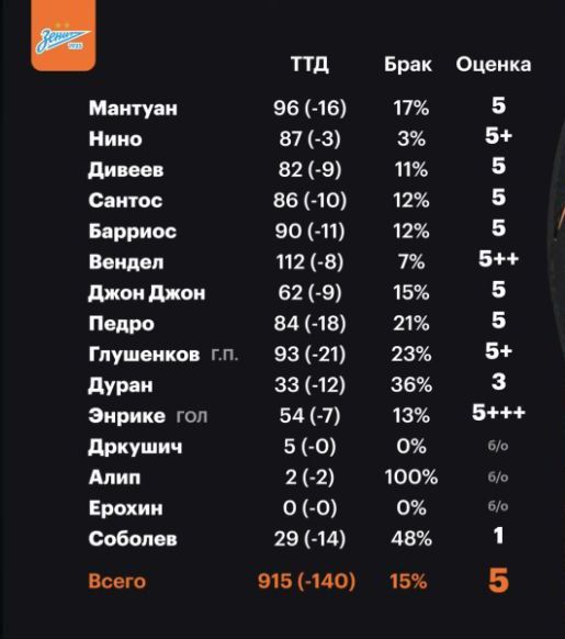 Петербургская команда выполнила 915 технико-тактических действий при 15% брака. Общая оценка сине-бело-голубых – пять.