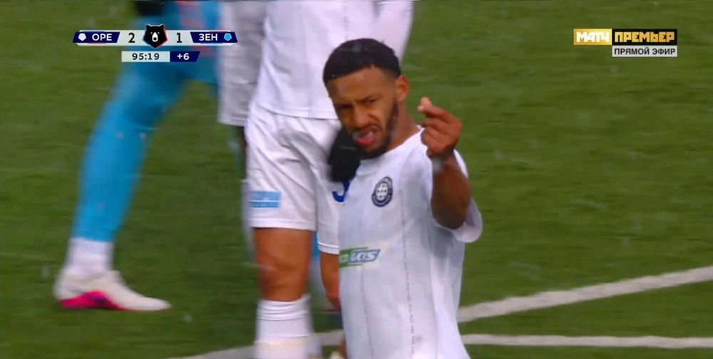 Защитник «Оренбурга» Фахд Муфи жестами отреагировал на назначение пенальти в ворота его команды на 90+4-й минуте матча 20-го тура РПЛ с «Зенитом» (2:1).