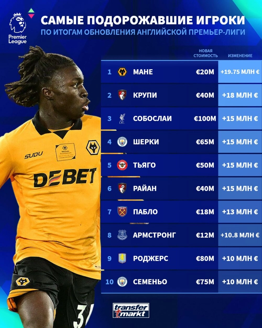 - Матеуш Мане («Вулверхэмптон») – 20 млн евро (+ 19,75 млн);