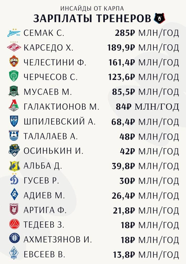 С отрывом лидирует возглавляющий «Зенит» Сергей Семак, которому платят 285 миллионов рублей ежегодно.