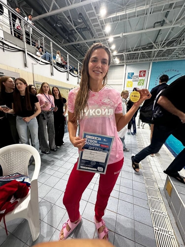 Спортсменка вышла на заплыв в шапке «Спартака», а после надела футболку красно‑белых на награждении.